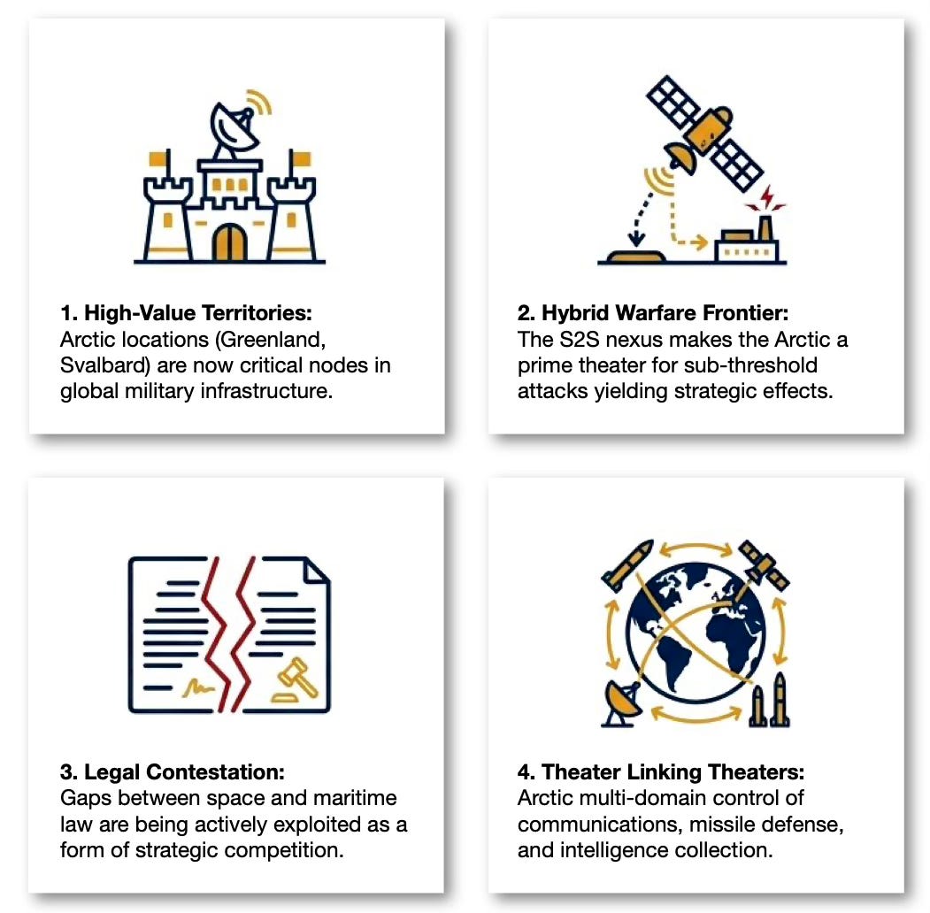 Greenland and Svalbard are critical military nodes; the S2S nexus enables hybrid operations, legal gaps are exploited strategically, and multi-domain control links communications, missile defense, and intelligence collection.