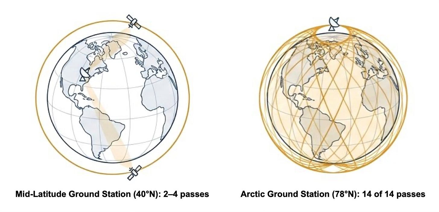 Consider a reconnaissance satellite. Polar orbits provide global coverage but converge at the poles. A ground station at 40°N might only contact a satellite three times daily [6]. In contrast, Greenland’s Pituffik Space Base at 76°N enables “14 of 14 capability”—near-continuous data collection [7].