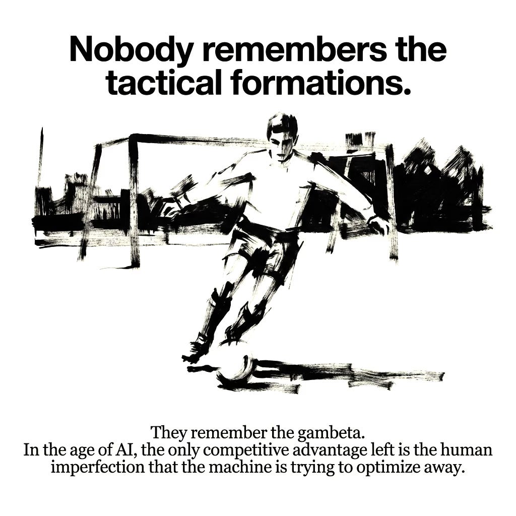 The choice, as always, is not between systems and creativity, between measurement and intuition, between Zubeldía and Menotti, between AI and human designers. The choice is whether we can hold both in productive tension, whether we can build frameworks that enable rather than constrain, whether we can use our most powerful tools to create space for human flourishing rather than eliminate it. Because in the end, nobody remembers the tactical formations. They remember the gambeta. They remember the moment of individual genius that transcended the system. They remember, in other words, exactly what Zubeldía spent his career trying to eliminate—and exactly what generative AI, if deployed without strategic wisdom, will eliminate at scale.