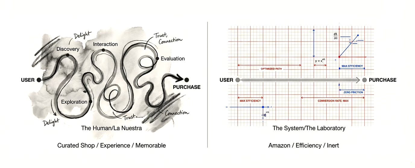 Consider the difference between Amazon’s checkout process—optimized to the point of being almost pre-conscious ritual, and the ritual of buying something from a small, well-curated shop. The former is objectively more efficient. The latter creates a memory. Amazon has optimized for conversion. The small shop has optimized for experience. These are not the same thing, and increasingly, they are inversely correlated.